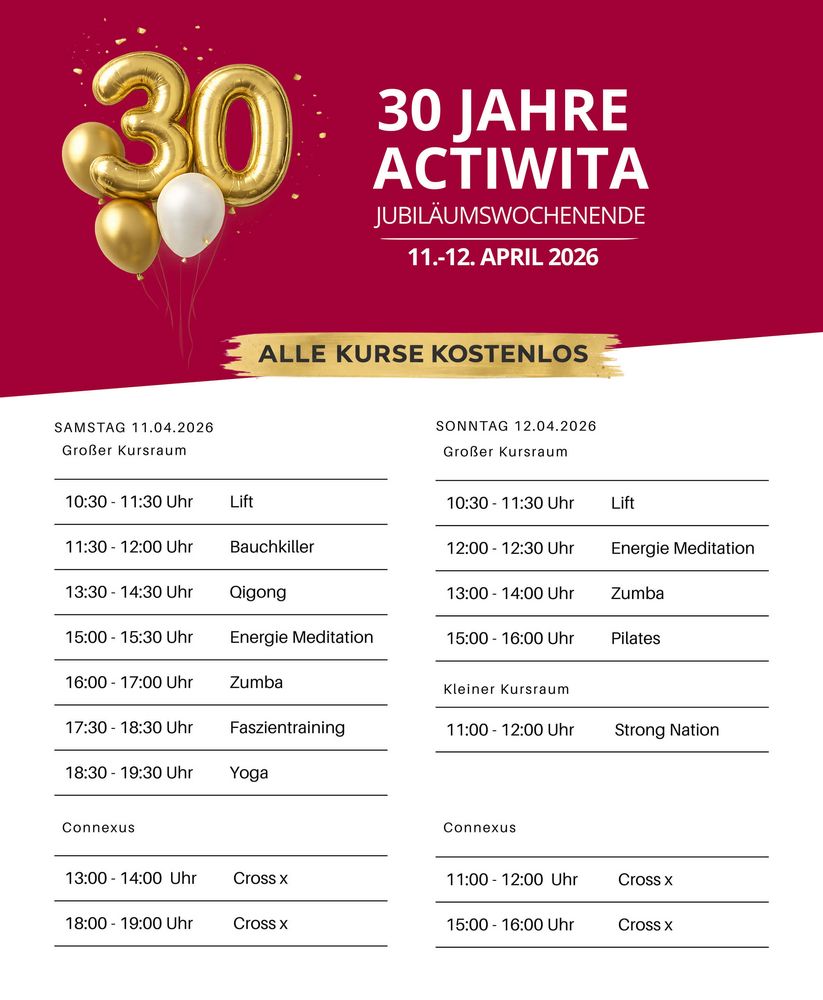 Seit drei Jahrzehnten stehen wir für Gesundheitstraining, persönliche Betreuung und nachhaltige Lösungen für mehr Wohlbefinden im Alltag. Dieses Jubiläum ist für uns nicht nur ein Grund zum Feiern, sondern auch ein großes Dankeschön an alle, die uns auf diesem Weg begleitet haben.