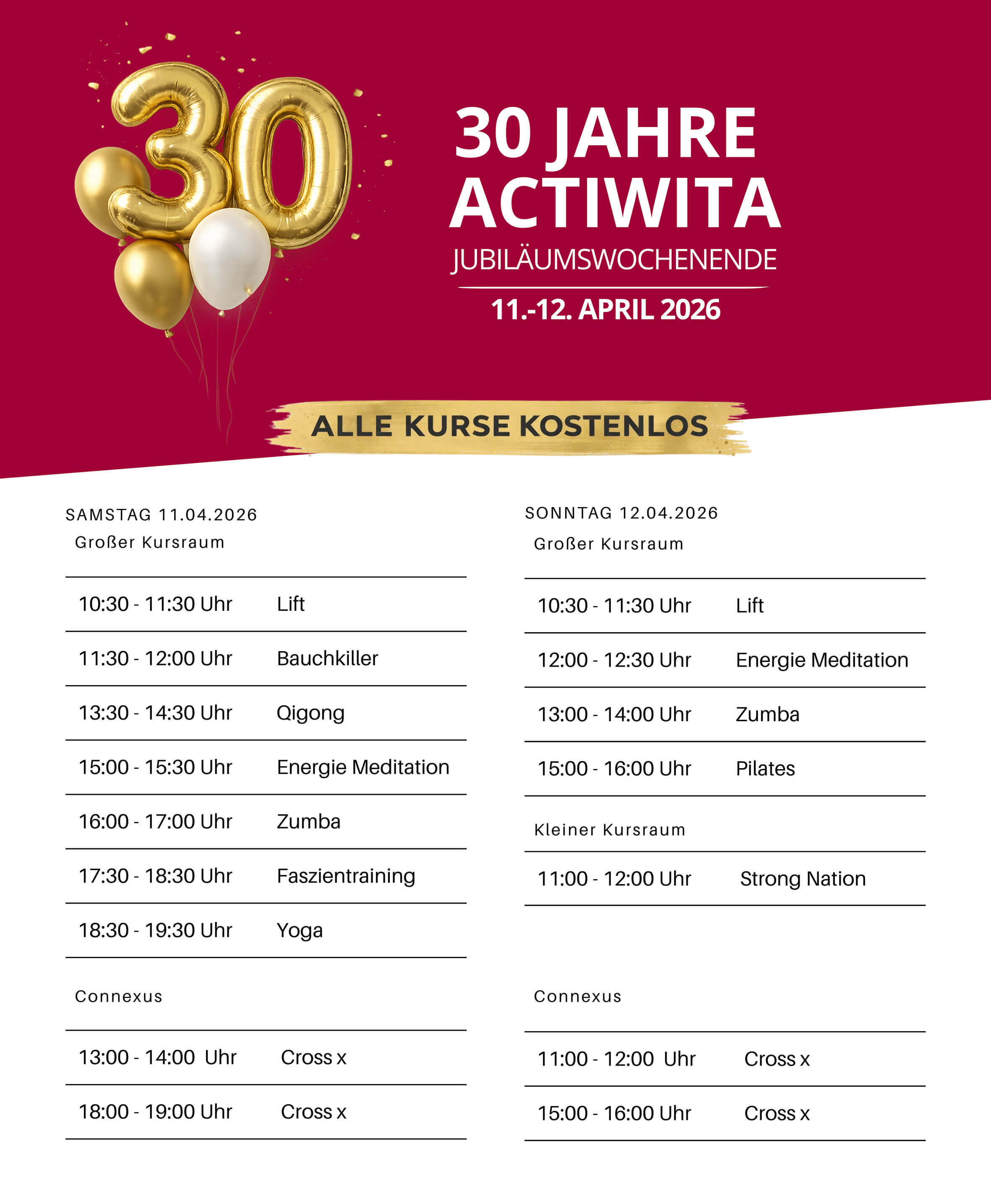 Komm vorbei, mach mit und feiere mit uns 30 Jahre Gesundheit, Bewegung und Lebensqualität.